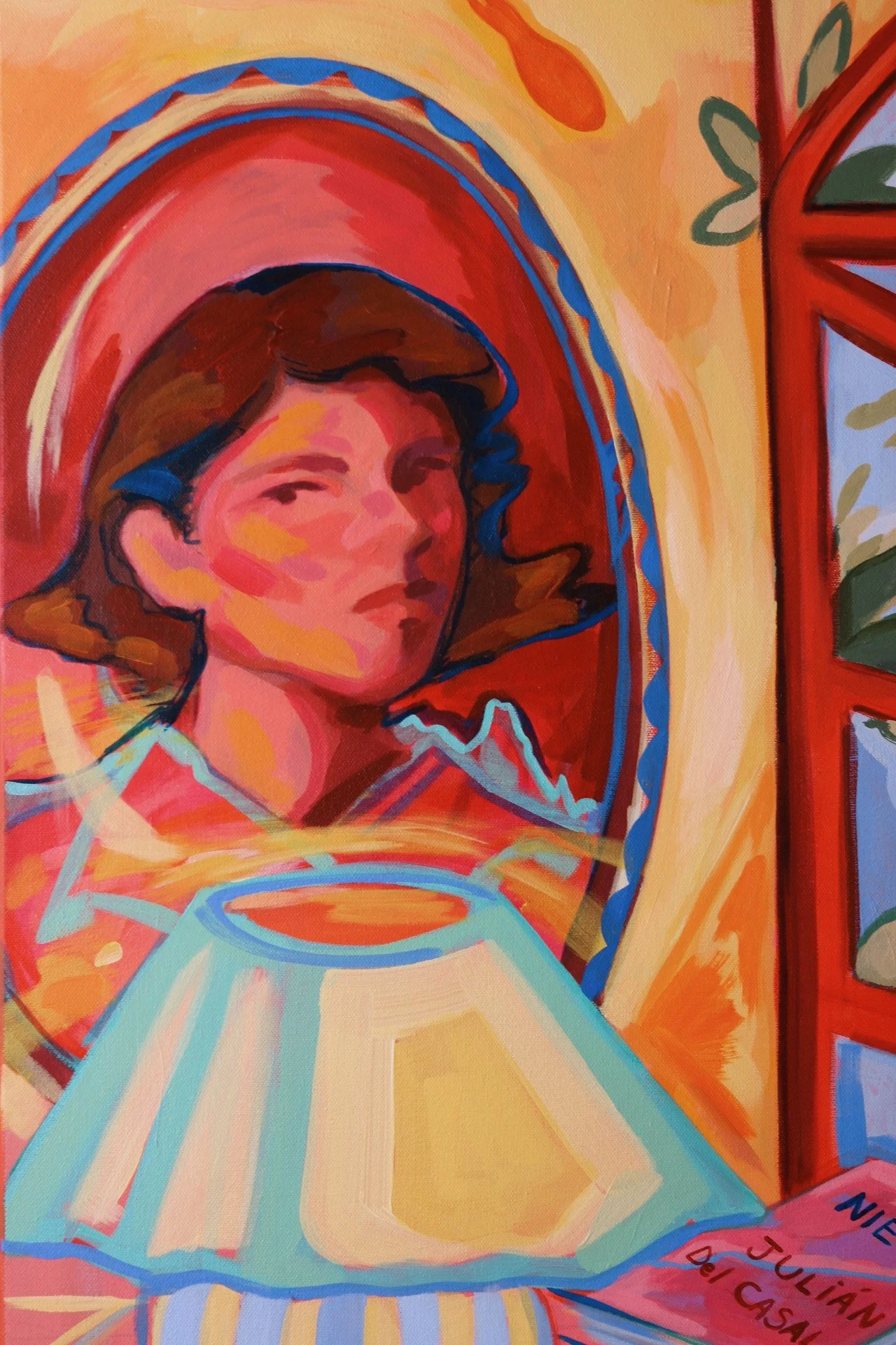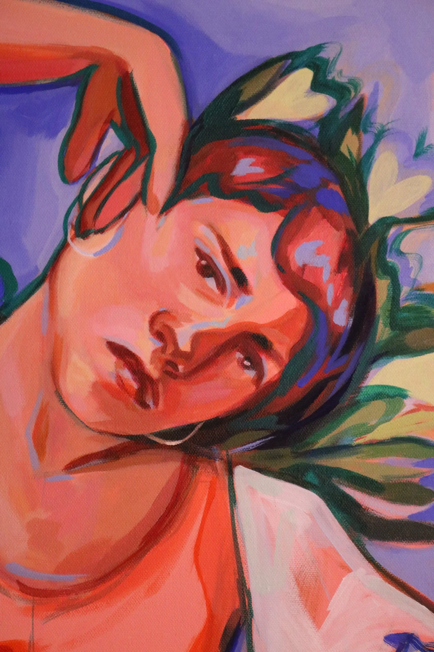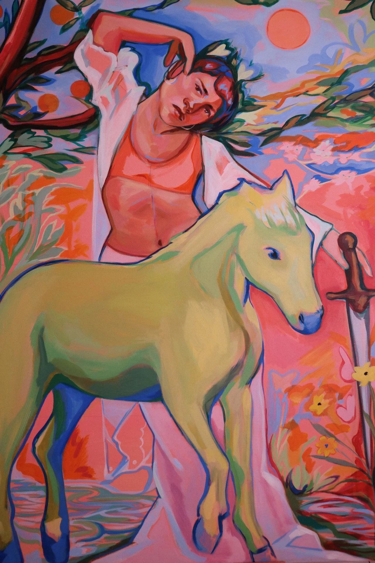 “The figure of the bride, much like the figure of the warrior, the poet, the nymph, the prophet, and the ballerina, have haunted my studio often. I believe we are inherited this initial woman, this mother and homemaker who never faulters and continually makes every right choice. These feminine archetypes have always fascinated and terrified me, as I negotiate and evolve into what a portrait of a woman looks like in my own adulthood. We have not yet built a world where every last woman is safe and has enough to provide for herself and her family through reasonable means, I think this is why I am drawn to the female figure again and again, and often paint my girls as larger than life. The women in my life are larger than any accolade or stage I’ve ever known.”